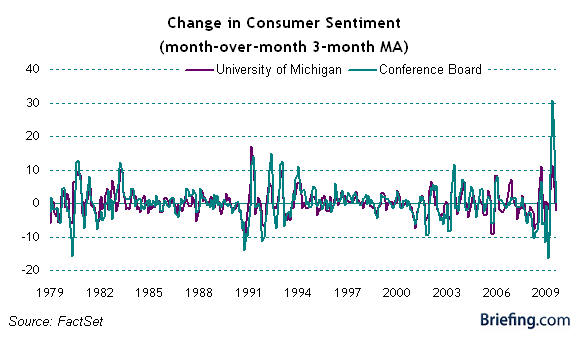Потребительские настроения весьма изменчивы. График выше учитывает трехмесячные усредненные показатели ежемесячных изменений в каждом из индексов с января 1979 по август 2009.